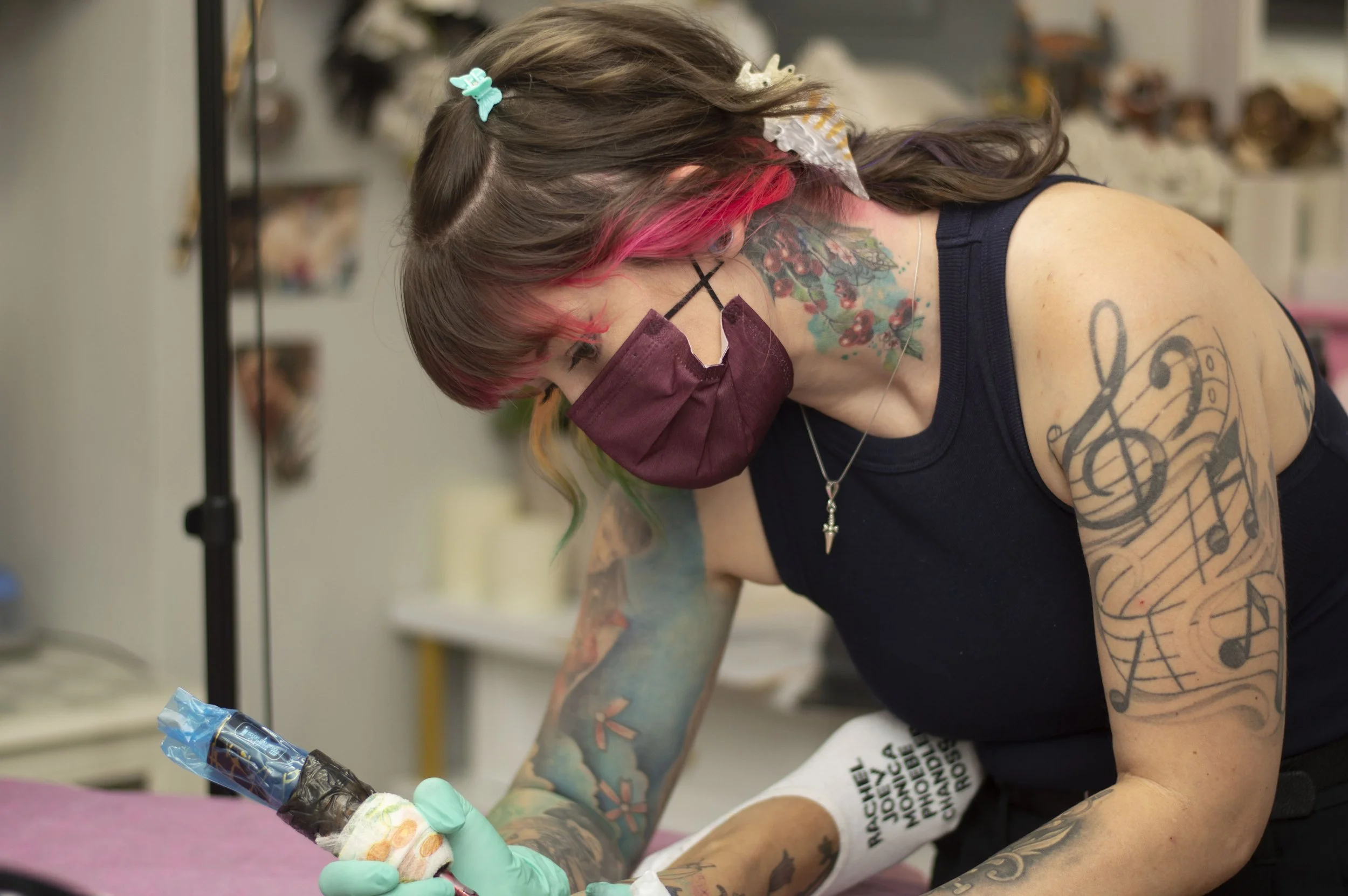 All tattoo artists must wear face masks during procedures. This is for the health and safety of our clients and our artists. We are creating large open wounds and it is important that they are not open to any contamination, particularly blood-born or air-born pathogens.